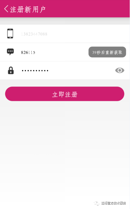 根据提示输入手机号并获取验证码;收到验证后填入并设置密码点立即注册,